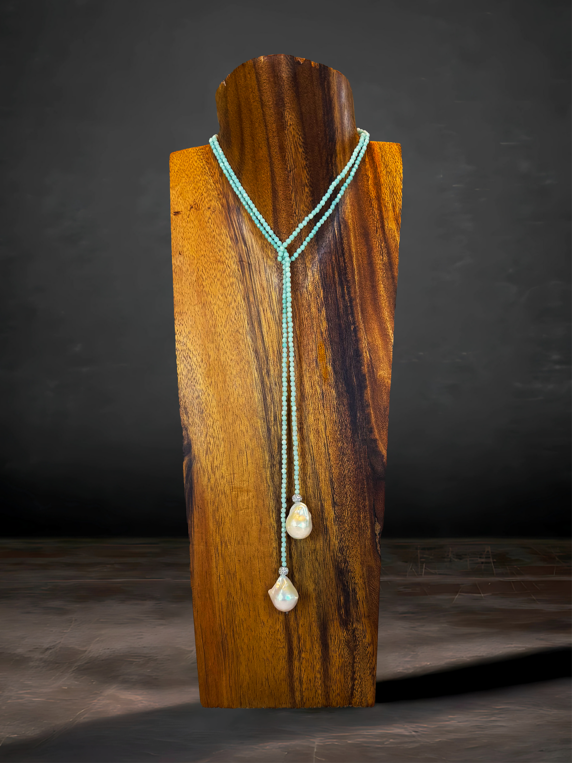 This 36" aqua quartz lariat features two Baroque freshwater pearls and CZ accents, creating an elegant statement piece with a natural twist.