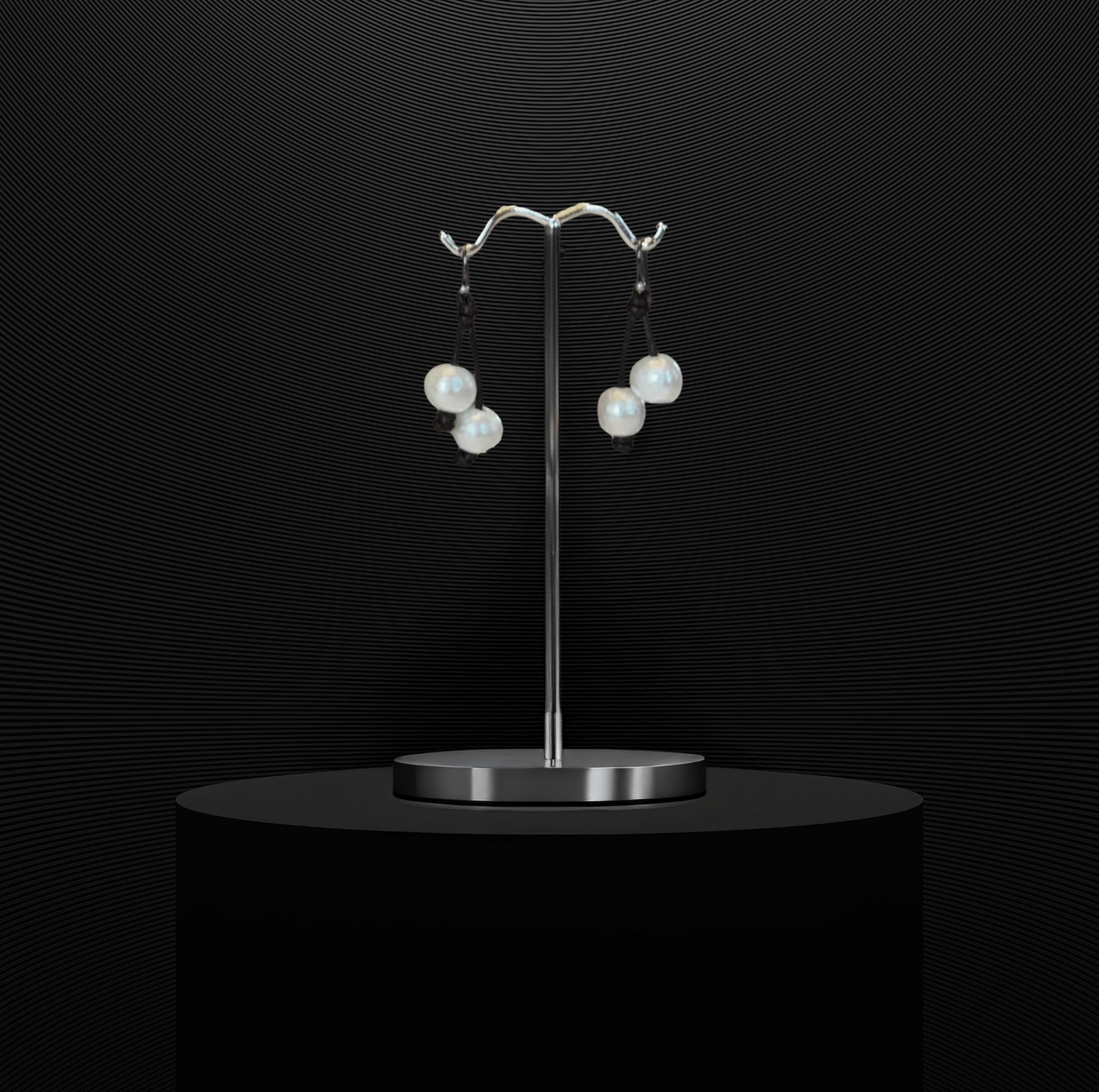 Double freshwater pearl drop earrings on Greek leather with sterling silver wire.