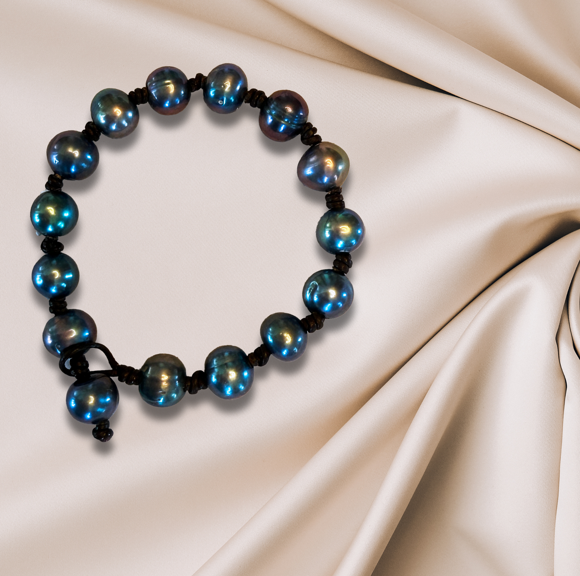 Peacock freshwater pearl bracelet, double-knotted on Greek leather for an organic feel.