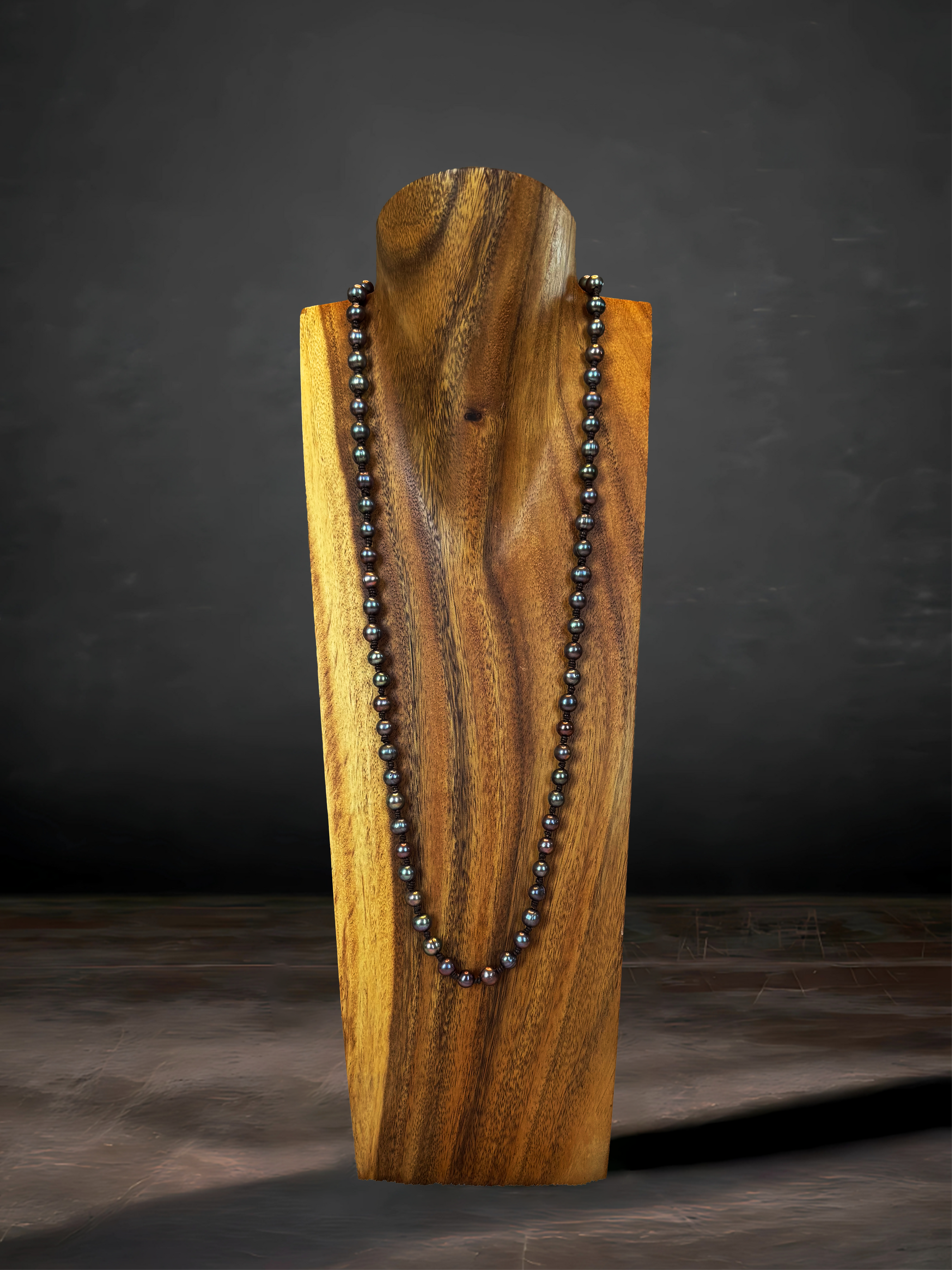 Double-knotted peacock freshwater pearls on Greek leather for a vibrant yet grounded design.