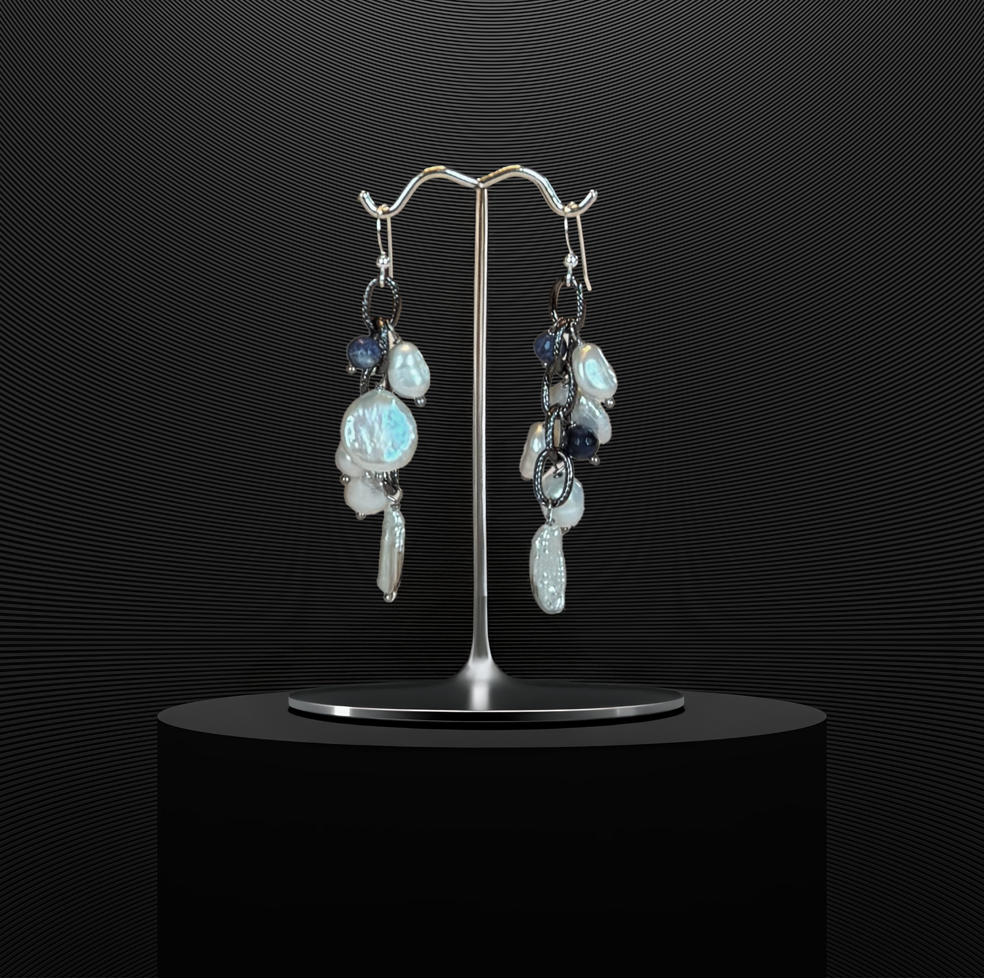Sodalite cluster earrings paired with freshwater pearls on sterling silver wire for a bold, earthy aesthetic.
