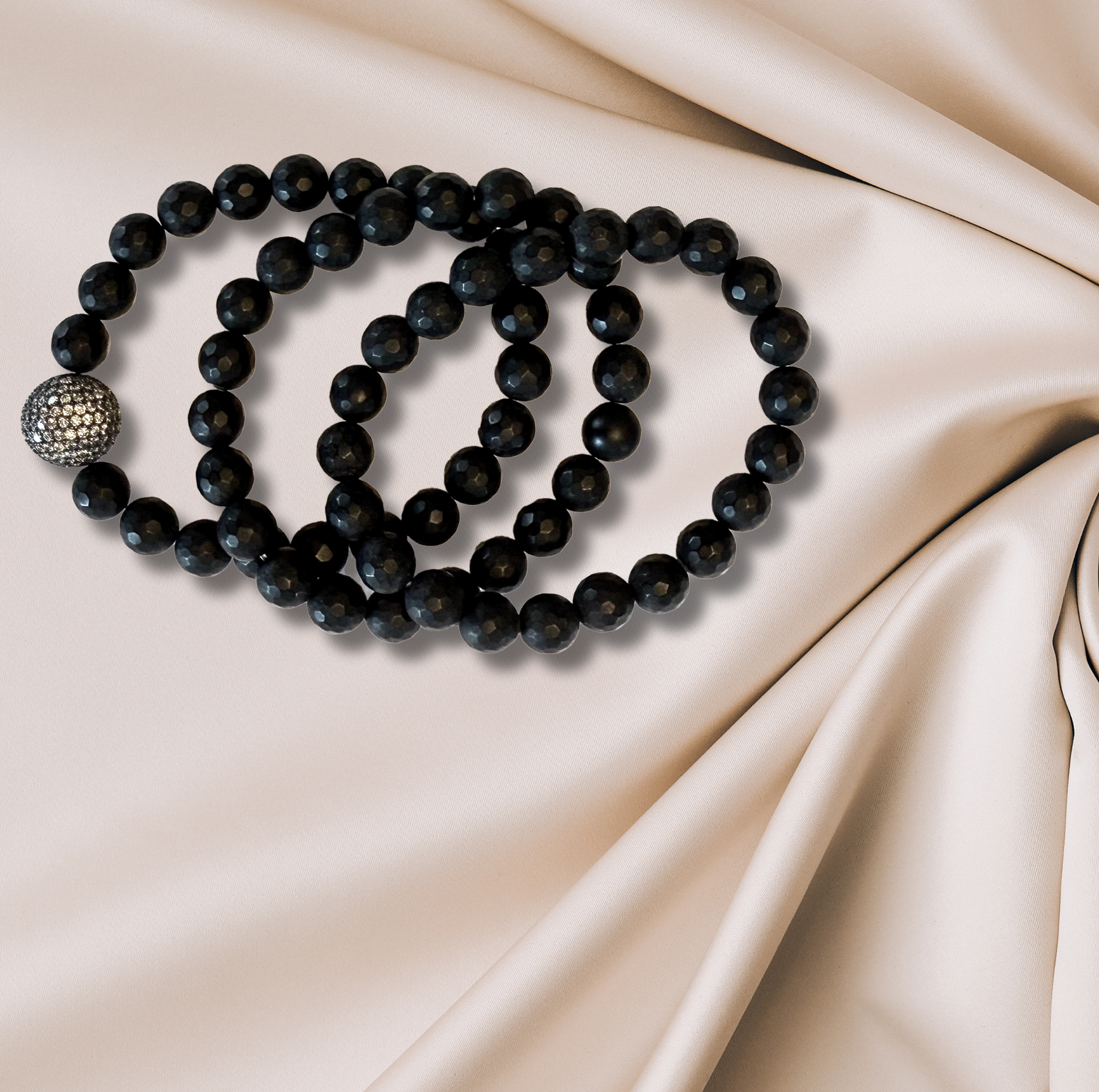 Three hematite bracelets with CZ accents, boasting a sleek, lustrous finish.